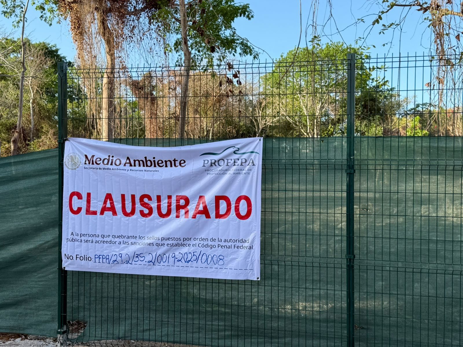 Este viernes amaneció una lona en el predio propiedad de la desarrolladora Awa, mismo donde se realizaron trabajos de desmonte para iniciar un proyecto inmobiliario. Esta es la primera sanción federal, ya que el municipio había clausurado hace unos días debido a que los desarrolladores no cumplieron con la normatividad ambiental en cuanto a la reubicación de fauna.